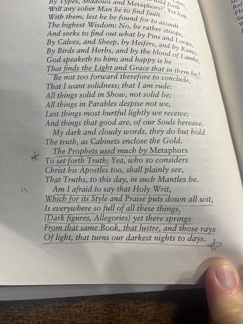 To begin with, I enjoyed Bunyan’s opening apology. “Apology” in this sense is a justification or a vindication, as opposed to an excuse.1 This apology is written in poetry of ten-syllables per line (called iambic pentameter), often with rhyming couplets. As I simultaneously study the Prophet Isaiah, a few lines in particular stood out to me: